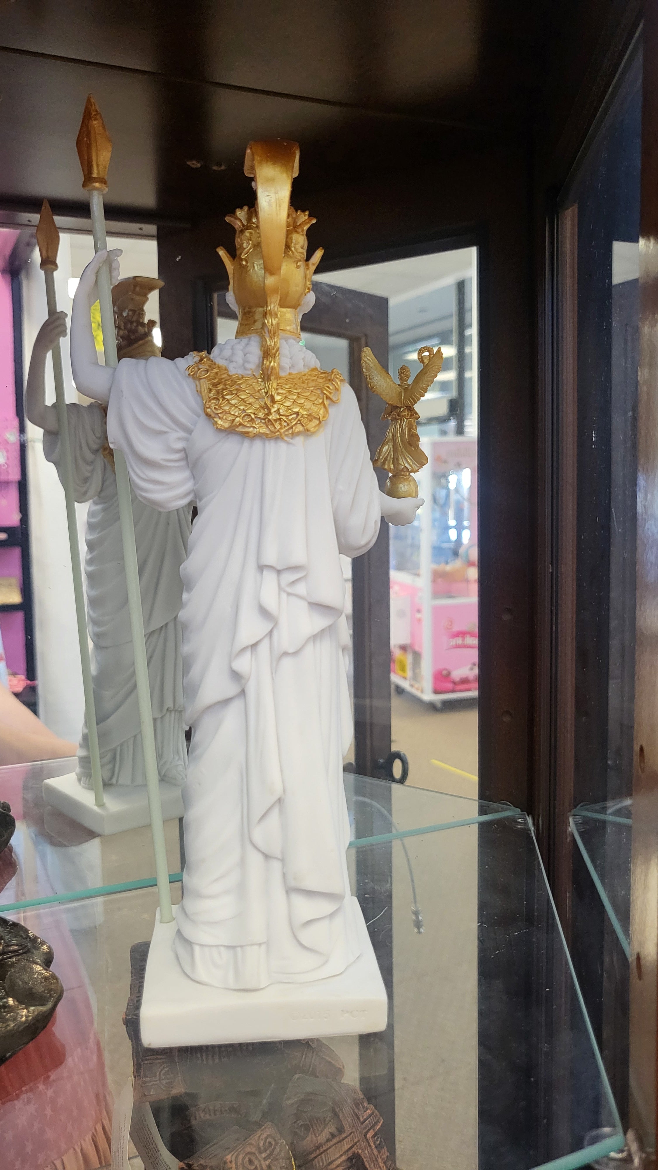 This statue of Athena is classically depicted, with the goddess Nike in her hand. She is made of polyresin, hand painted and polished.