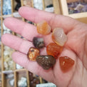 Our tumbled carnelian pieces are between 7/8'' to 1 1/4' in size. The photo is of some example products, and the piece you receive may vary in size and colour. These pieces range from pink carnelian to very dark red agate.