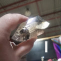 • F: Lightly smoky, hazy mineral inclusion, one included "child" point, some small surface pitting, 18 faces, 257 g, 11 cm long