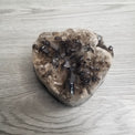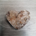 Piece E is 8.5 cm across the top of the heart and has a very pronounced geode of smokey quartz crystals on a base of white quartz. It is 4.7 cm high at its tallest point.