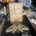 Elevate your reading space with an enchanting touch of celestial magic using this lasercut wooden altar piece featuring a stunning moth adorned with stars and moons on its wings. Perfect for displaying one tarot or oracle card at a time.