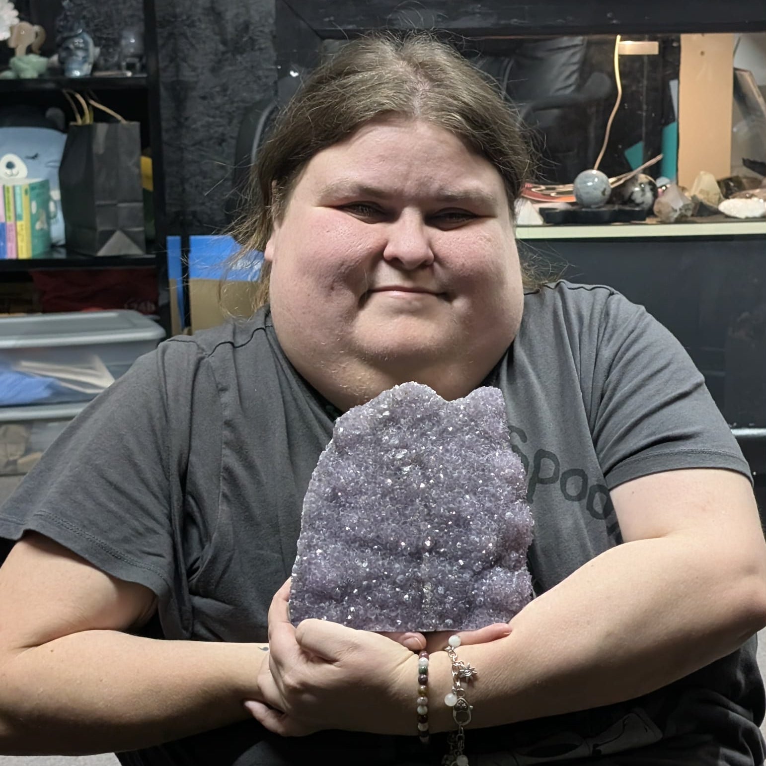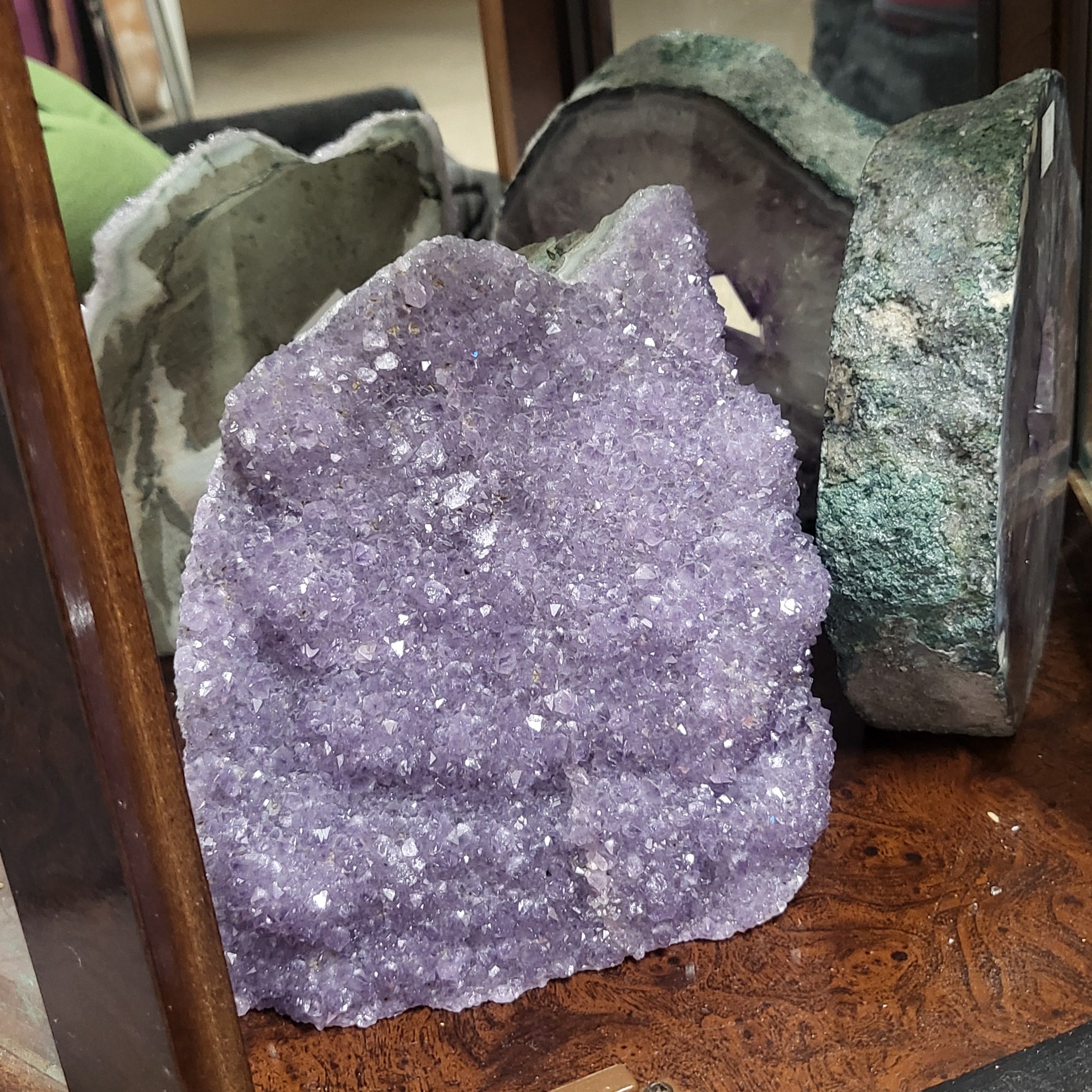 This STUNNING amethyst piece sparkles like mad! It's 7.5" tall, 7.5" wide and makes for an eye-catching display. The good energy this exudes is unbelievable.
