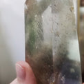 This beautiful natural point has been polished to better admire its interior. While technically a Shamanic Dream Stone (a smoky quartz combining phantoms or unique formations with various mineral inclusions), it can also be classified primarily as a hair stone - a quartz featuring a quantity of very thin, needle-like inclusions of rutile, actinolite, tourmaline, or other minerals. Mostly, it is a Thetis hair stone (green and reddish-brown needles), but on careful inspection, one will find that it is also an Angel hair stone (nearly invisible silvery needles). This particular stone also features a scattering of very small rainbows and a small cloud (as well as a few tiny "puffs") of unidentified whitish mineral. There also seems to be a vague phantom near the bottom.
